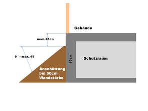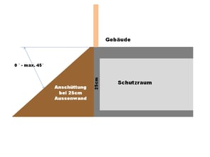 Schutzräume befinden sich meistens im Untergeschoss und müssen je nach Wandstärke ganz oder teilweise mit Erde angeschüttet sein. Die entsprechende Anschüttung dient dem Strahlenschutz und darf nicht entfernt werden.